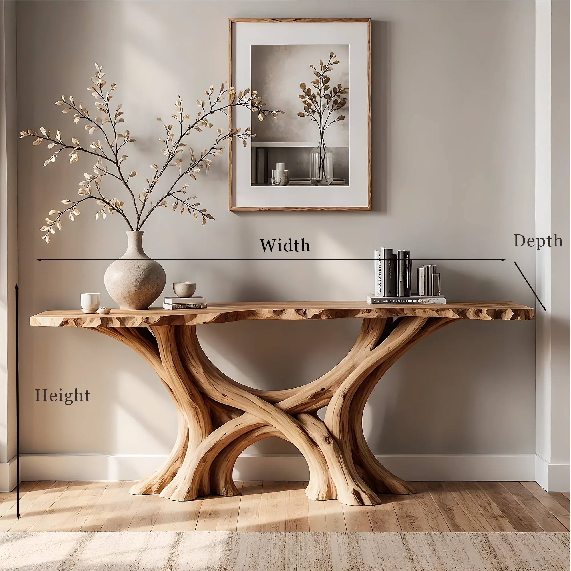 Every table tells its own story through variations in wood pattern and shade. These marks of authenticity give the piece depth and personality. Positioned in a hallway, living room, or entryway, it instantly enhances the atmosphere with a sense of calm craftsmanship.