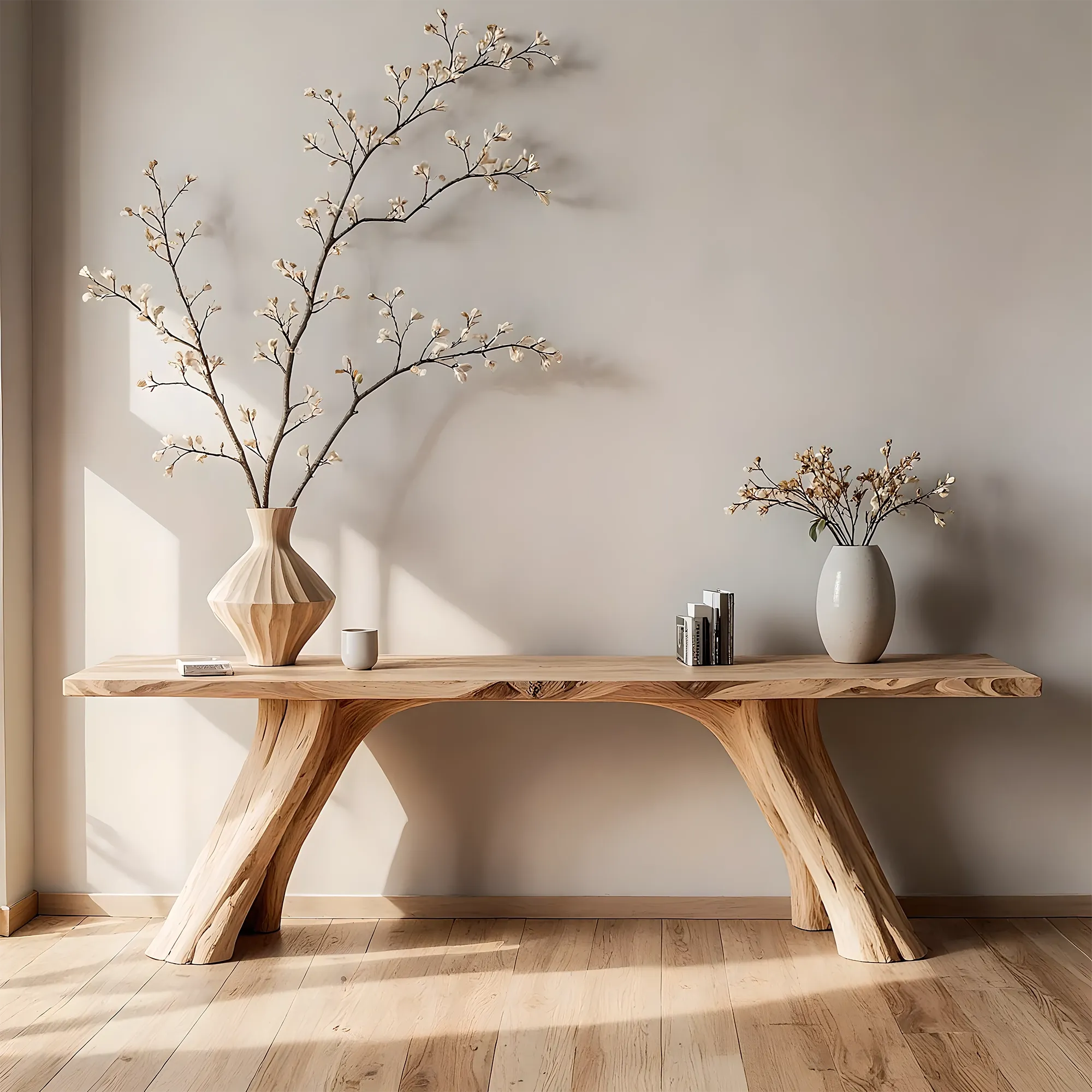 This console table complements both contemporary and farmhouse interiors. Pair it with a round mirror or a vase of dried botanicals for an inviting entryway setup. As time passes, the wood matures beautifully, gaining a patina that enriches its rustic appeal.