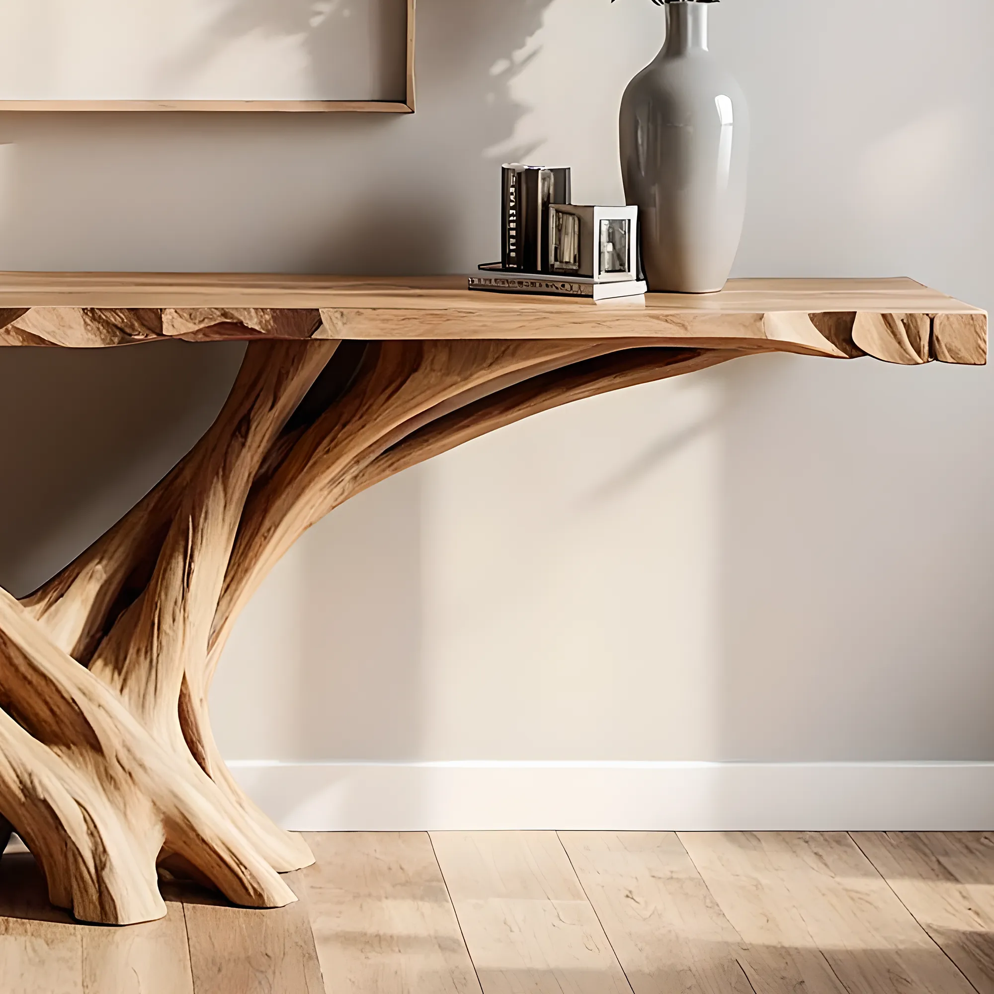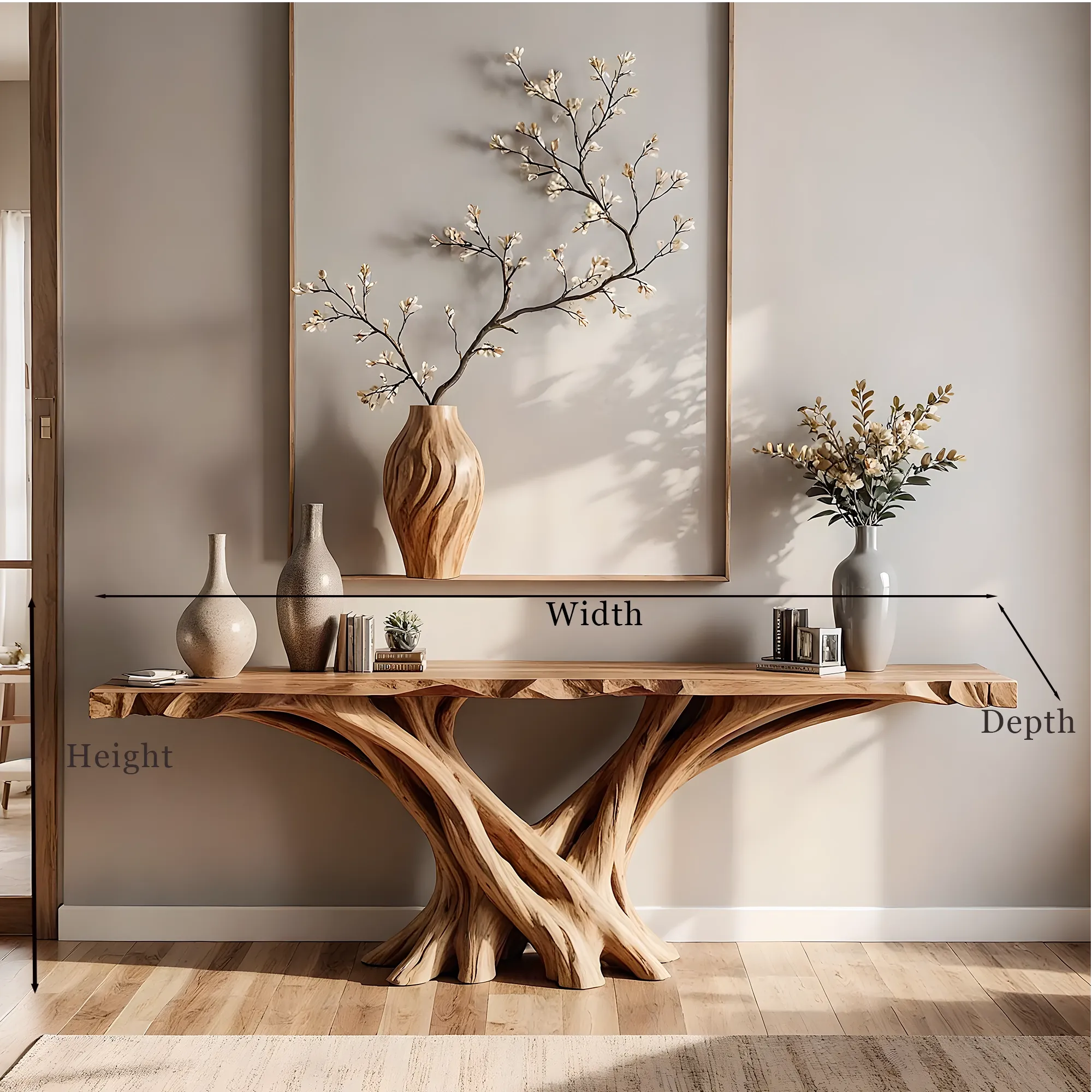 Made from solid wood, the table top follows the tree’s natural contour, finished to a soft matte glow that reveals beautiful grain patterns. The sturdy frame supports its weight effortlessly, while maintaining a balanced silhouette that complements entryways, hallways, or living areas.
